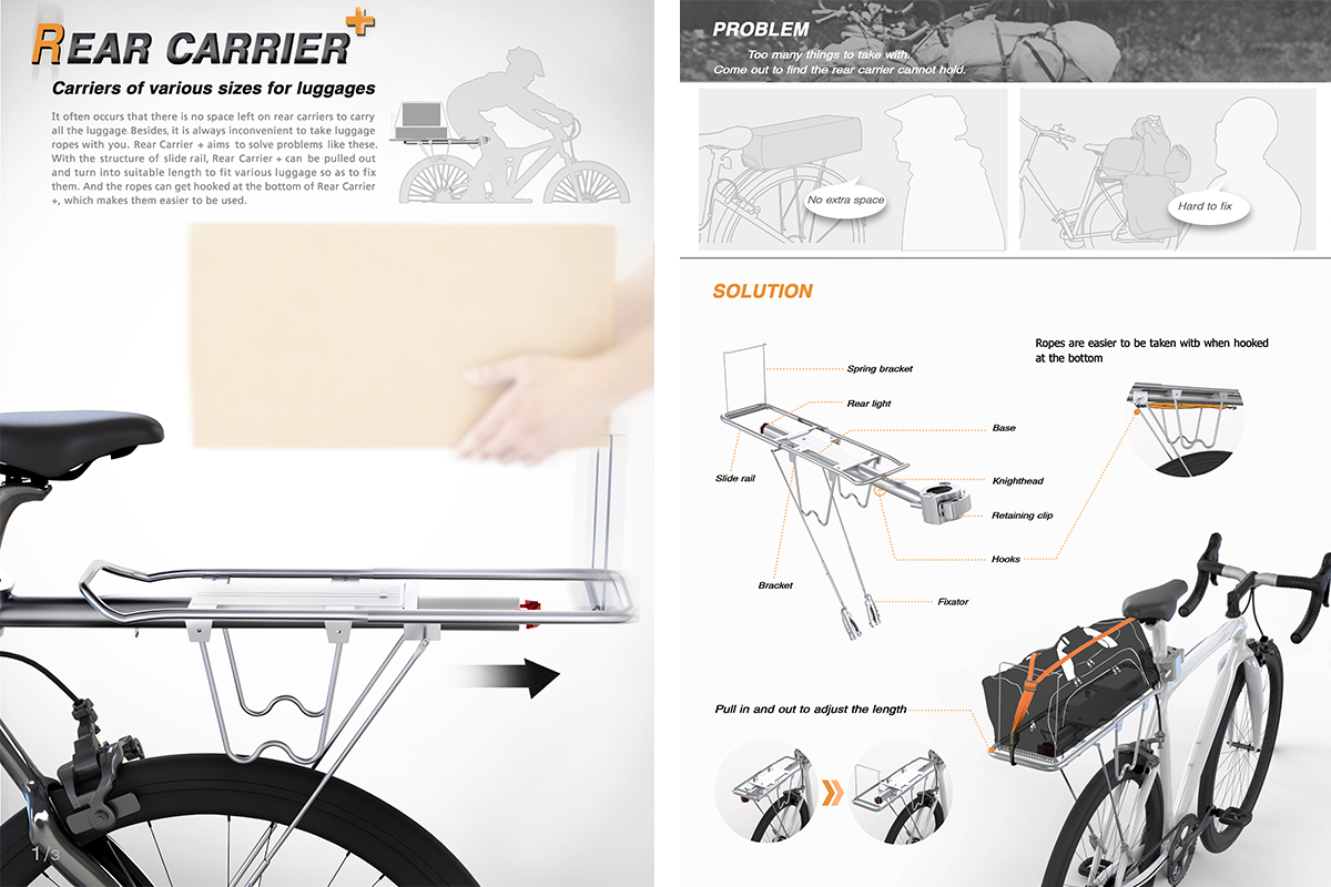 伴随绿色健康的出行理念,人们外出越来越倾向于选择骑自行车。然而自行车后架截面有限,不具备多种载物能力;而物品放置在车龙头则很容易造成安全隐患。《Rear Carrier+》旨在用一种简单快捷的方式解决以上问题:车架增设了滑轨,可以使得车架自由延展从而实现不同尺寸物品的装载功能,给出行带来更多便利。