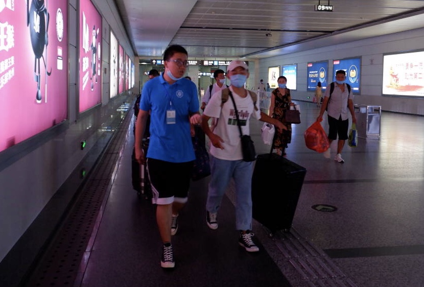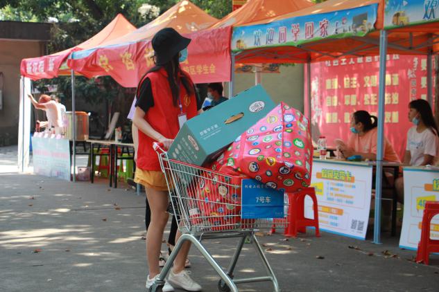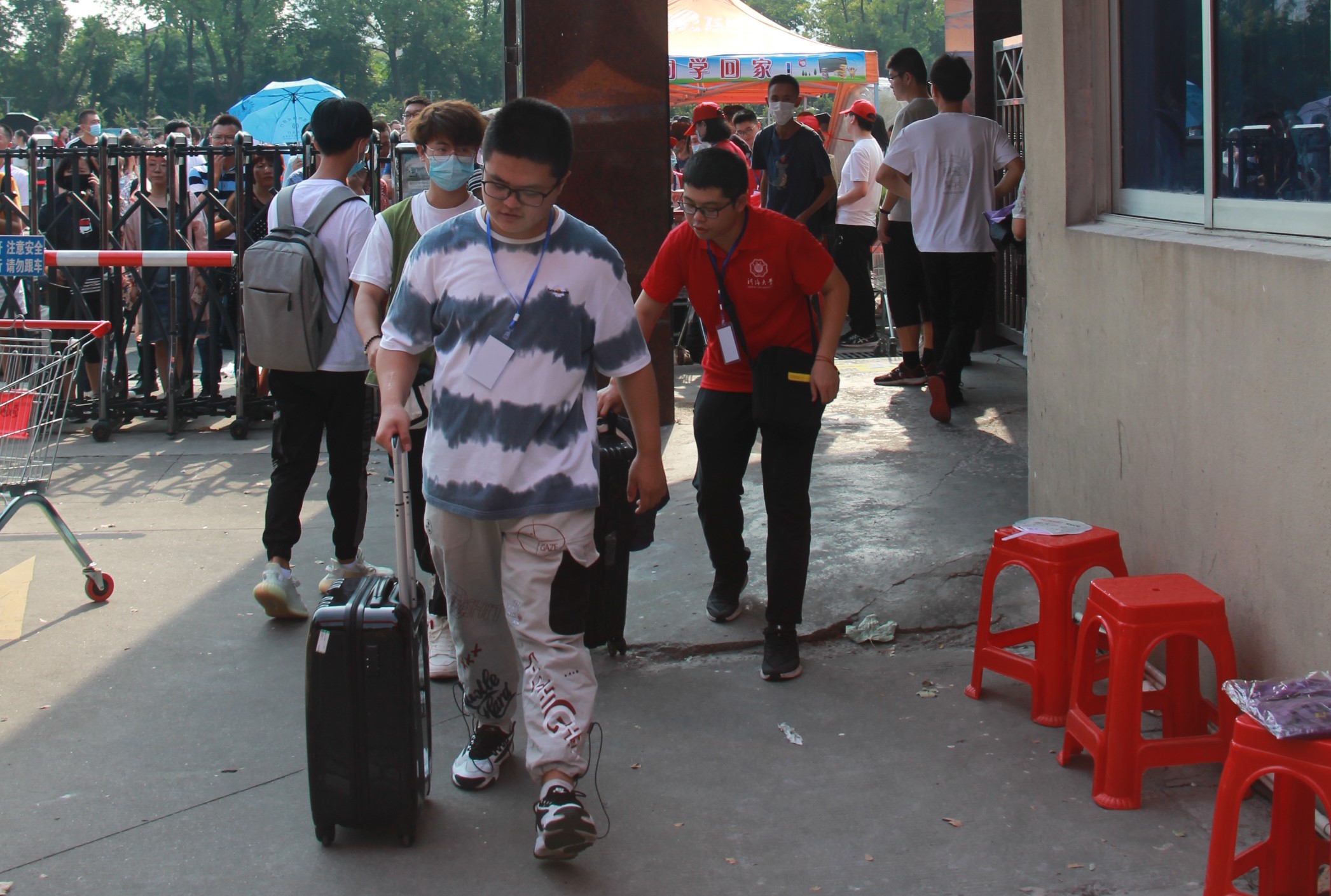因为疫情缘故,家长不能进校,学长学姐们热心帮助新生将所有行李都提到宿舍。