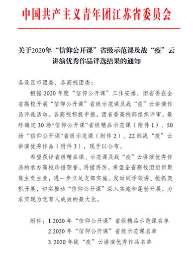 由公司团委组织开展的“学习青年楷模恽代英,争做‘三有’时代新人”青马公开课,在近日揭晓的2020年度全省“信仰公开课”省级示范课评选活动中获得“省级示范课”荣誉。本次公开课得到了河海大学马克思主义学院、“常州三杰”纪念馆的大力支持,常州电视台的关注与报道,并通过新媒体平台进行全程直播,体现了“大思政”育人理念,产生了良好的社会影响,是学院开展理想信念教育的重要举措。