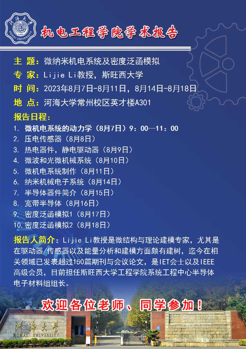 【机电大讲堂】微纳米机电系统及密度泛函模拟——系列报告