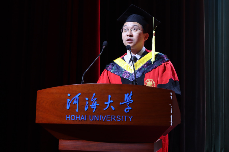 毕业典礼上,丁坤经理向各位学有所成的同学表示最热烈的祝贺,向为此付出艰辛劳动的全体教职员工致以衷心的感谢。他说,四年前同学们从五湖四海走进晋陵北路200号,如今你们从河海大道1915号奔向更美好的未来。四年里,同学们学到了真知识、练就了硬本领,展示出一流的专业素养,一路勇往直前、闯关升级,取得了今天令人骄傲的成绩。