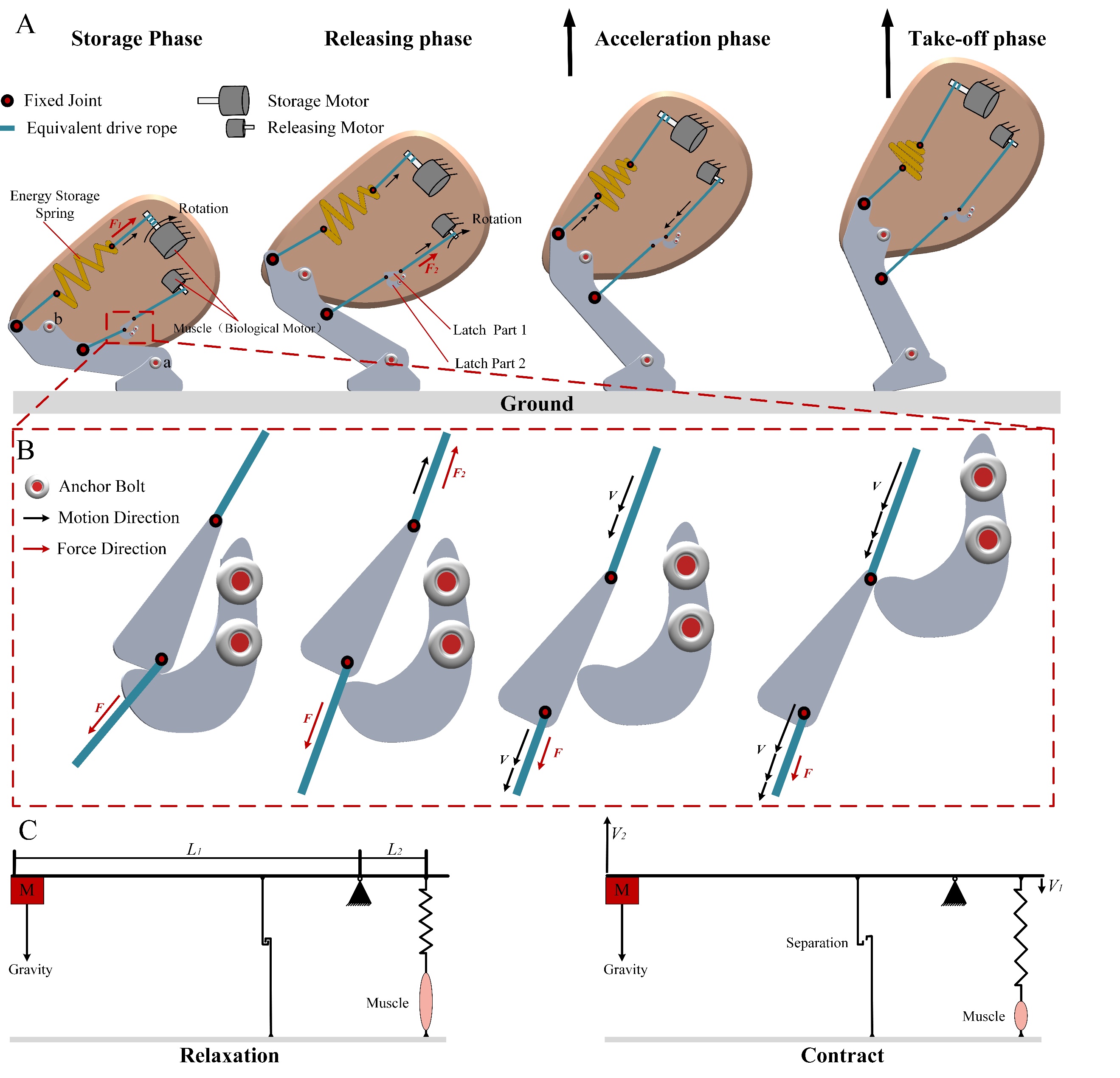 面对复杂的现实场景,单一的运动模式往往难以有效应对。跳跃机器人相对于传统的移动机器人拥有更强的越障能力,其可以轻易翻越数倍甚至数十倍于自身尺寸的障碍。在自然界中存在着许多具有优秀跳跃能力,高敏捷性的生物,尤其是昆虫类,它们的跳跃高度通常为身长的数倍至数百倍不等,例如蝗虫,跳蚤,吹泡虫等。通过对跳甲跳跃过程的拆解分析,其跳跃过程的等效模型如图1所示,该等效模型解释了其能够实现高速跳跃的普遍机理,生物肌肉的拉伸行程通常较为有限,但通过一定的机械增益可以将肌肉的拉伸行程放大。在等效机械模型中,甲虫的弹性外壳以及肌腱蛋白等被等效为一储能弹簧。在等效模型中对甲虫的跳跃过程进行拆解,同样的分为四个阶段,这四个阶段分别为:蓄能阶段、释能阶段、加速阶段和起跳阶段。
