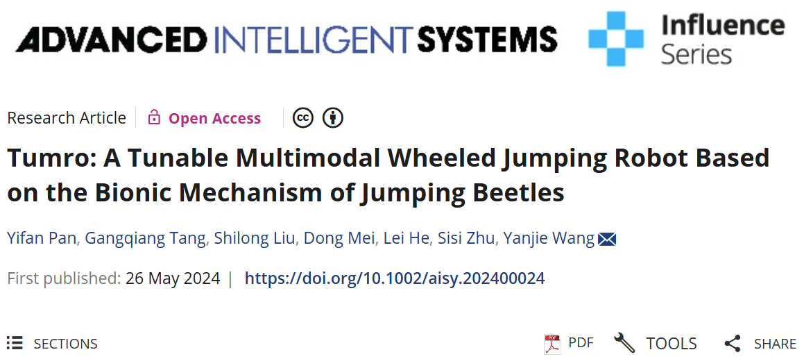 随着移动机器人技术的发展,大多数的场景下机器人已经能够取代人工进行工作与探测。但在一些复杂的场景下,传统的单一运动模式机器人往往难以有效工作。因此现阶段机器人朝着更加灵活,多功能的方向发展。传统移动机器人的障碍穿越能力有限,在面对高于自身高度的障碍物例如楼梯、碎石、沟渠等非结构路面时甚至难以移动。跳跃机器人相对于传统的移动机器人拥有更强的越障能力,其可以轻易翻越数倍甚至数十倍于自身尺寸的障碍。近日,河海大学江苏省特种机器人重点实验室王延杰教授团队在国际期刊Advanced Intelligent Systems上发表以“Tumro: A Tunable Multimodal Wheeled Jumping Robot Based on the Bionic Mechanism of Jumping Beetles”为题的研究性论文。该工作从以跳甲的蓄能跳跃机理出发并结合功乘原理,提出了一种小电机驱动的具有多种运动模式的小型跳跃机器人(图1),该机器人具有快速的轮式运动与优良的跳跃运动,有望在未来的复杂地形探测以及地外低重力行星探测发挥作用。目前该工作已被Advanced Science News报道(https://www.advancedsciencenews.com/meet-tumro-a-jumping-robot-inspired-by-beetles/),河海大学王延杰教授为该论文的独立通讯作者,硕士研究生潘一帆为论文第一作者。