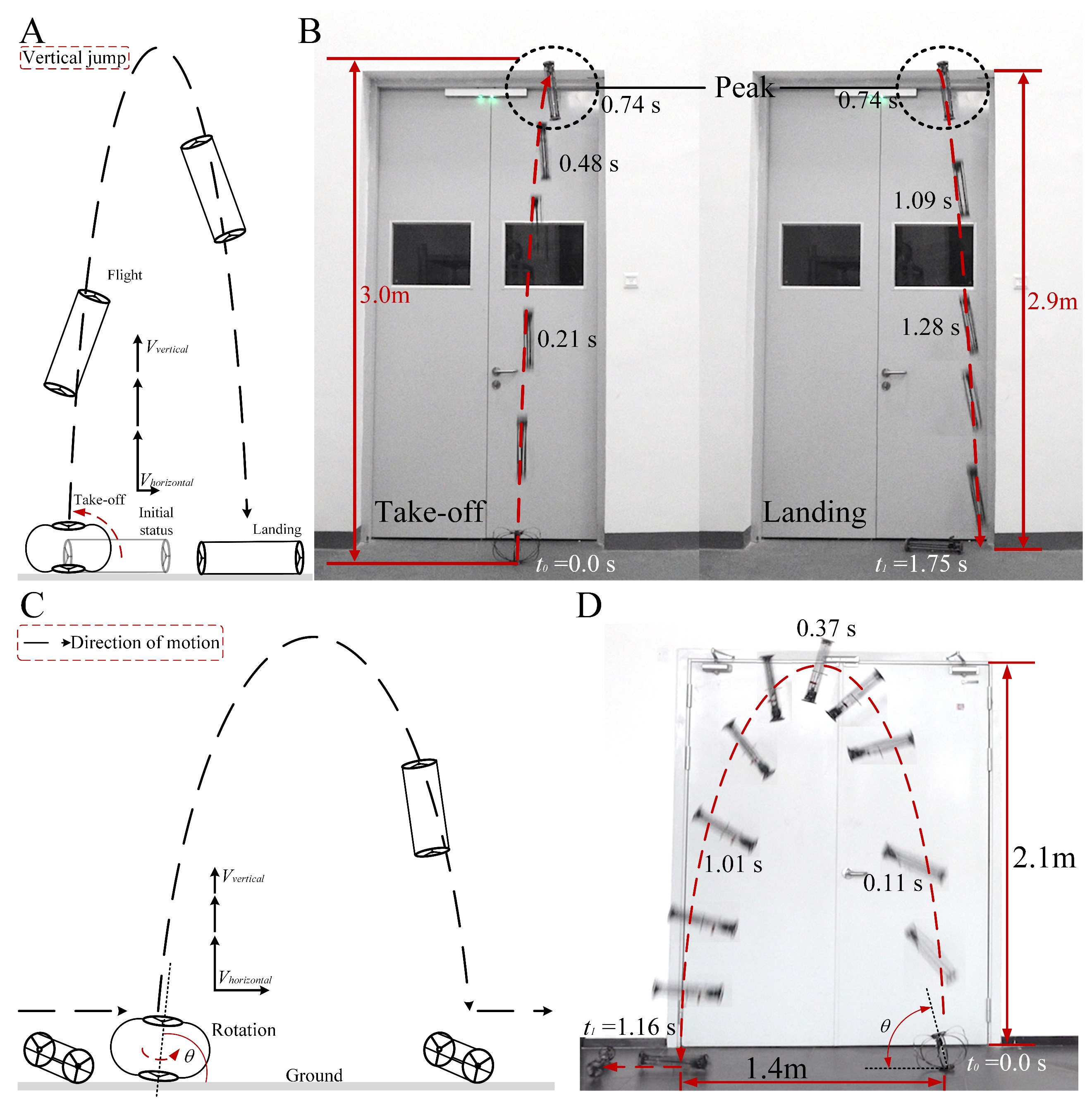 如图4所示,我们对机器人的跳跃性能进行了测试,在近乎垂直的起跳角度下,机器人能够实现垂直高度3m的跳跃,在倾斜的情况下,机器人能够实现1.4m的水平距离与2.1m的垂直高度的跳跃。