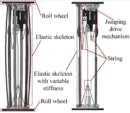 具有多种运动模式的跳跃机器人,能够适应更多场景,具有灵活性与高机动性的机器人对未来的复杂场景探测至关重要。然而目前的多模式跳跃机器人在机动性与灵活性上仍有进一步进步的空间,跳跃后的姿态调整以及额外的蓄能跳跃机构也是限制现有多模式跳跃机器人机动性能的关键因素。因此,受甲虫跳跃蓄能机制启发,将蓄能机构融入到机器人本体结构中以进一步的精简结构,课题组提出了一种多模式跳跃机器人,该机器人在蓄能时即可完成姿态切换,且在跳跃落地后无需姿态调整可立刻进入到轮式爬行运动模式。机器人的最大跳跃高度达到3.0m,跳跃的峰值功率能够达到233.97W,能够通过最小70mm高的狭小空间,其最小转向半径为160mm(图3)。