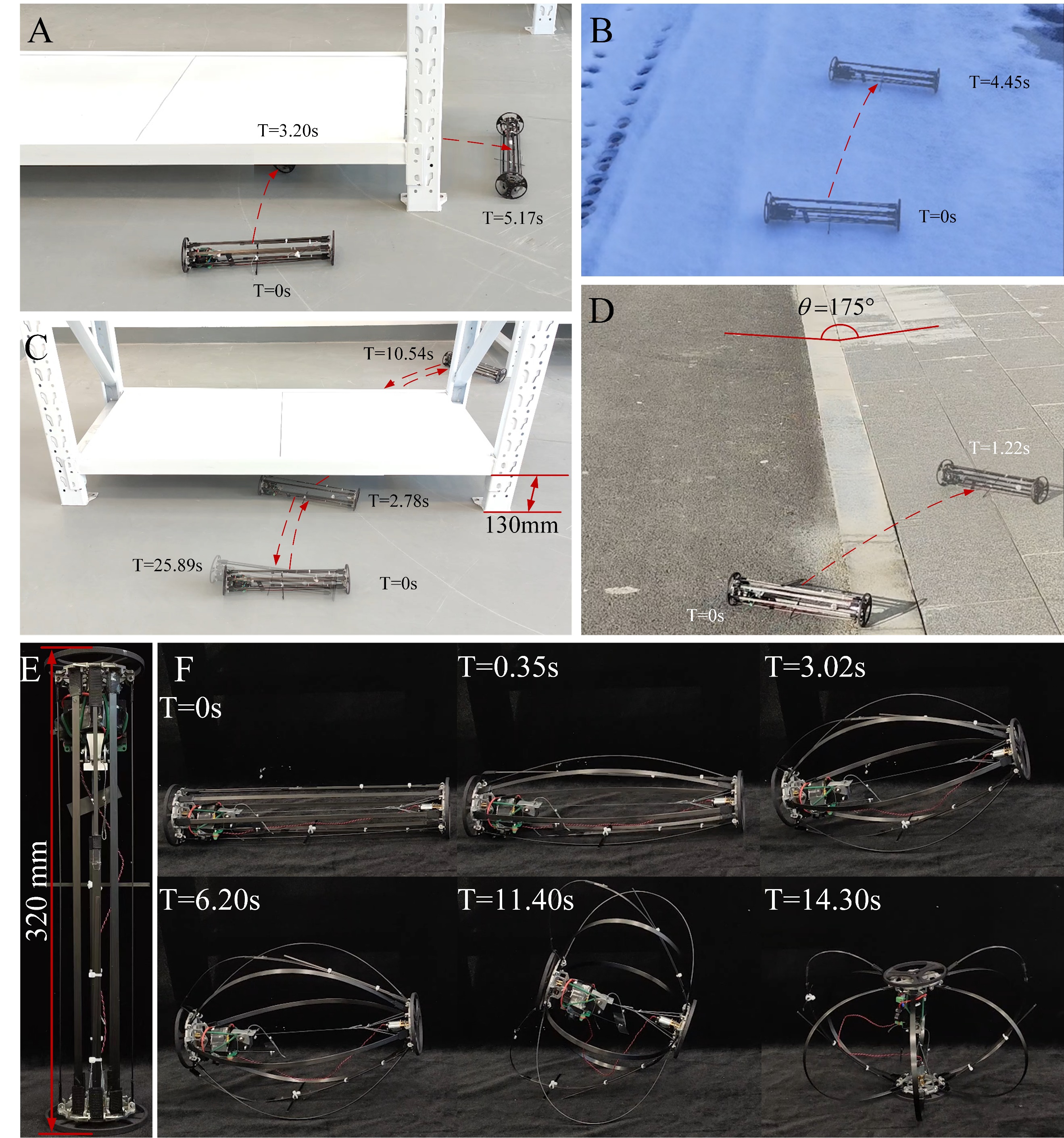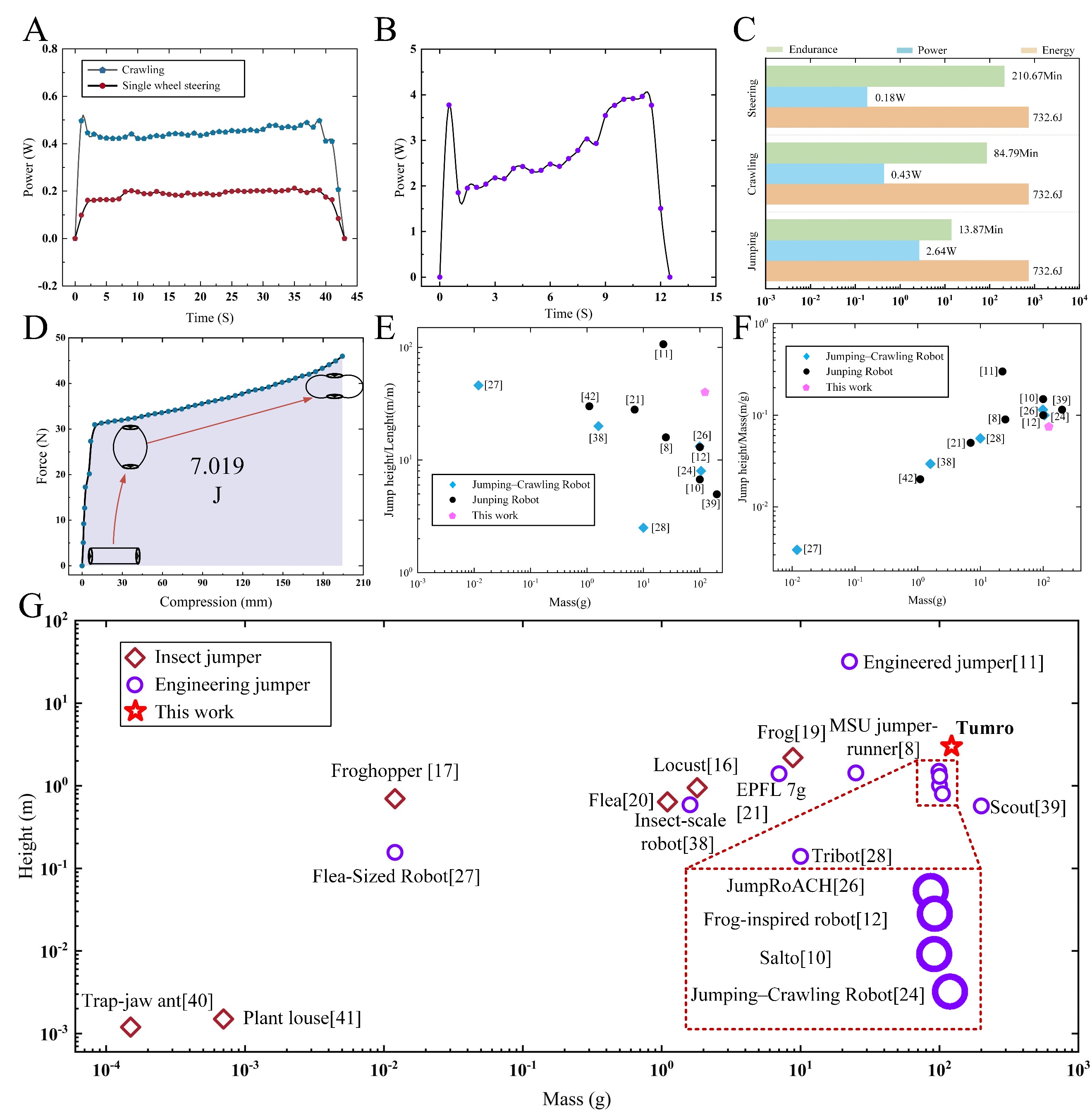 机器人在轮式爬行状态下,其前行以及原地转向运动状态的平均功耗为0.43W,在单边旋转运动状态下的平均功耗为0.18W(图5A-C)。对比显示,本工作所提出的多模式跳跃机器人在质量更大的前提下,仍能在跳跃高度上具有一定的领先。同时,机器人的机构设计与位姿改变策略使得机器人能够在较小的高度内实现爬行通过,因此在低矮空间的通过性上仍较现有的多模式机器人有一定的优势(图5E-G)。
