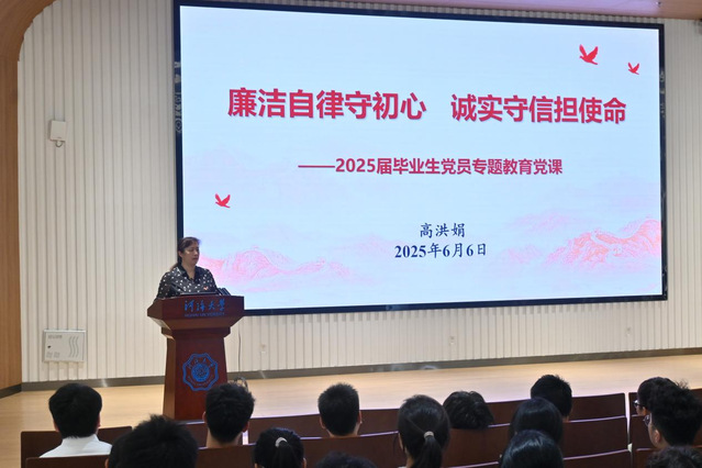 随后,高洪娟书记为2025届毕业生党员讲授“廉洁自律守初心,诚实守信担使命”专题党课。党课结合中央八项规定及《中国共产党纪律处分条例》,深入浅出地阐述了廉洁自律的重要性,强调毕业生党员要筑牢思想防线,严守纪律规矩,在新的岗位上始终保持清正廉洁的作风,以实际行动彰显共产党员的先进性和纯洁性。