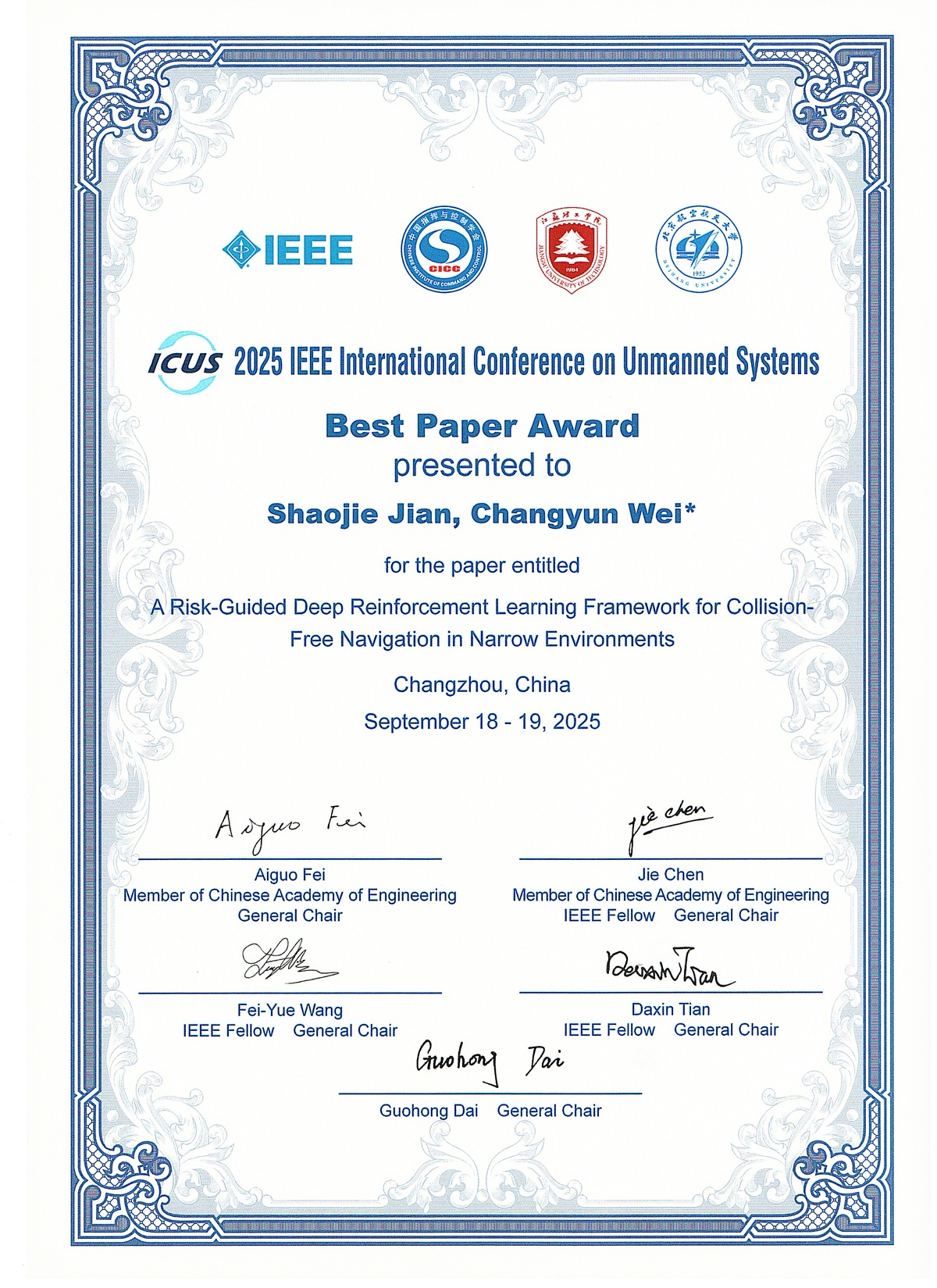 2025年9月18-19日,由中国指挥与控制学会、IEEE 南京分会主办,中国指挥与控制学会无人系统专业委员会承办的 2025 第八届 IEEE 国际无人系统大会(ICUS 2025)在江苏常州召开。bw西汉姆联硕士研究生简少杰(导师:魏长赟教授)以第一作者身份发表的论文,荣获大会最佳论文奖,论文题目为《A Risk-Guided Deep Reinforcement Learning Framework for Collision-Free Navigation in Narrow Environments》。